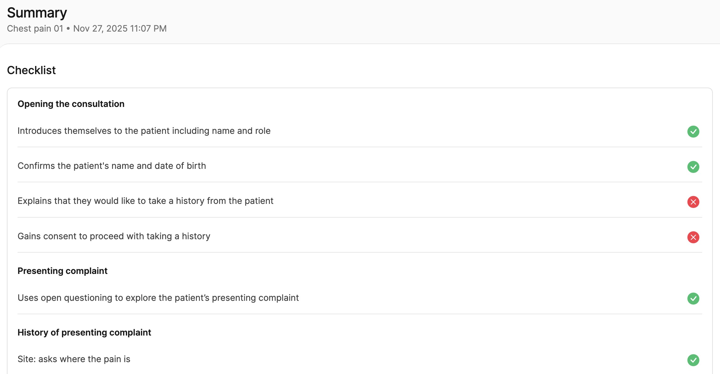 When you convert a patient script in SimChat, the platform automatically generates a checklist.