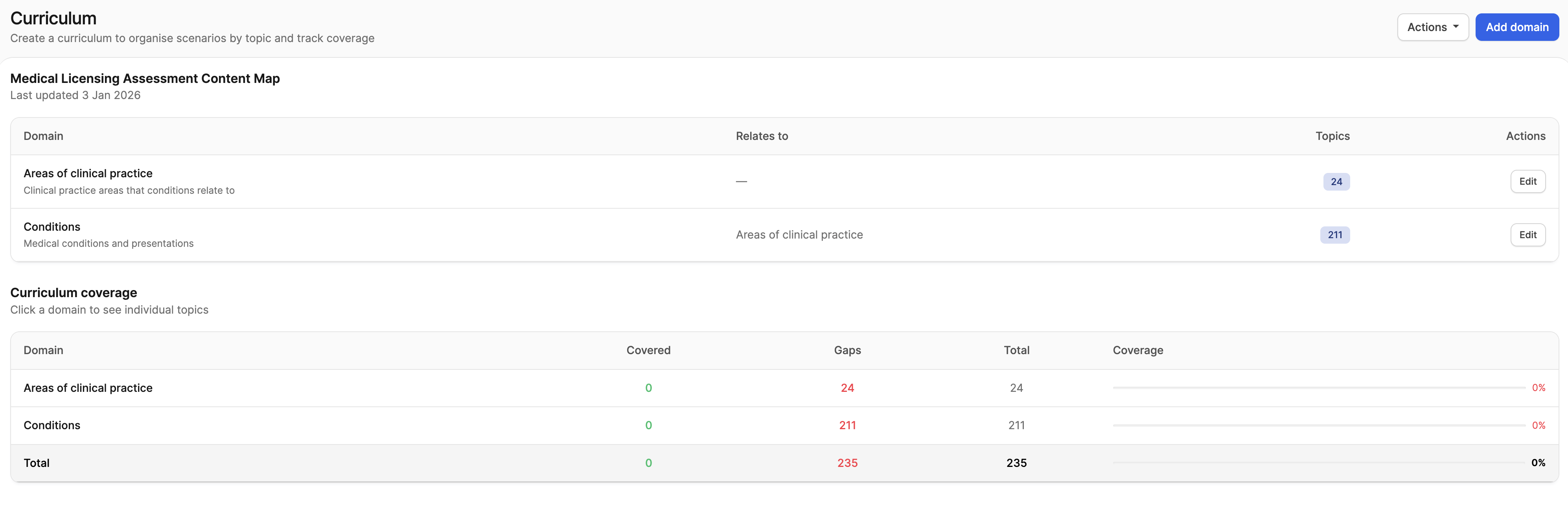 You can view coverage by domain and topic, including what is covered and where gaps remain.