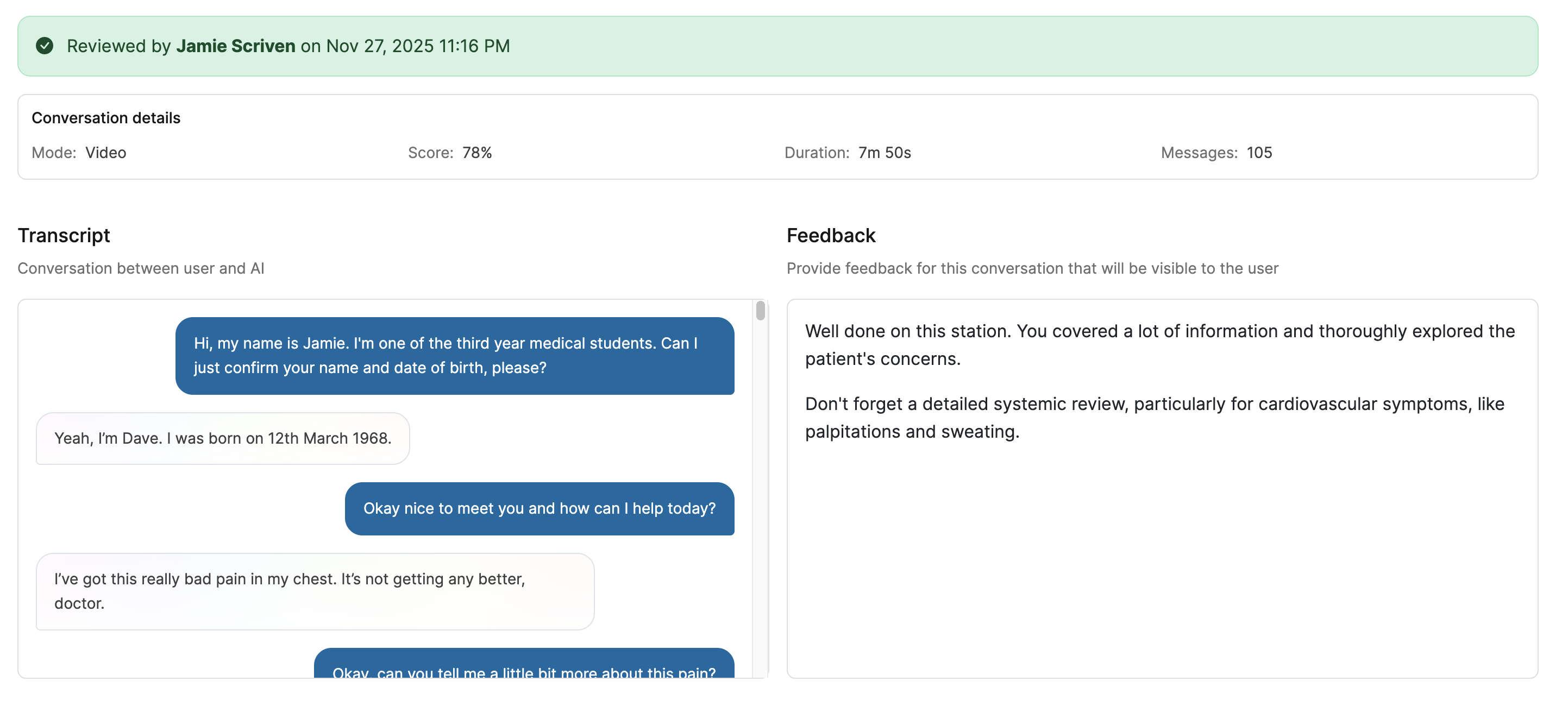 Because exports are based on real learner interactions, they provide clear evidence of what happened in the consultation and what to improve next.